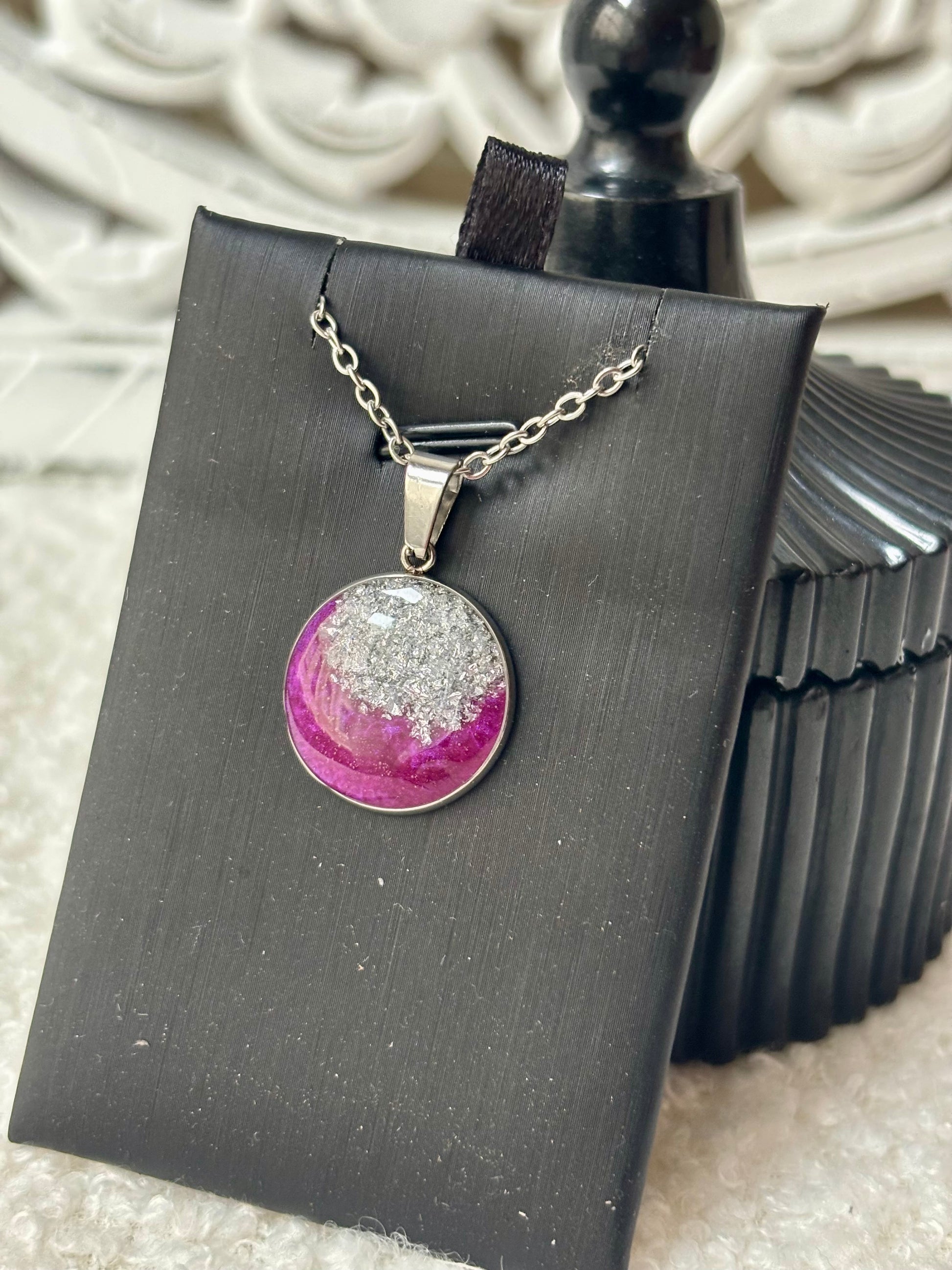 Élégant et intemporel, ce collier en acier inoxydable argenté est sublimé par une touche de résine colorée réalisée à la main. Un bijou délicat qui capte la lumière et apporte une note de couleur subtile, parfait pour rehausser une tenue tout en finesse.