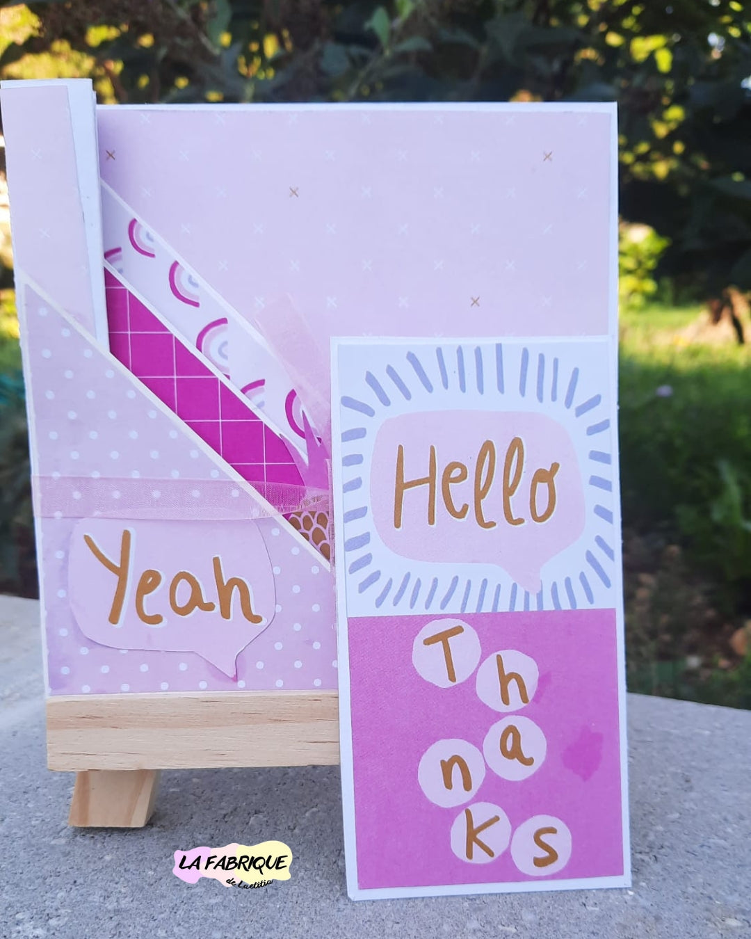 Carte avec des triangles et une petite carte glisse. Le tout avec un ruban pour fermé. Collection de papier Pink is my favourite Colour.
