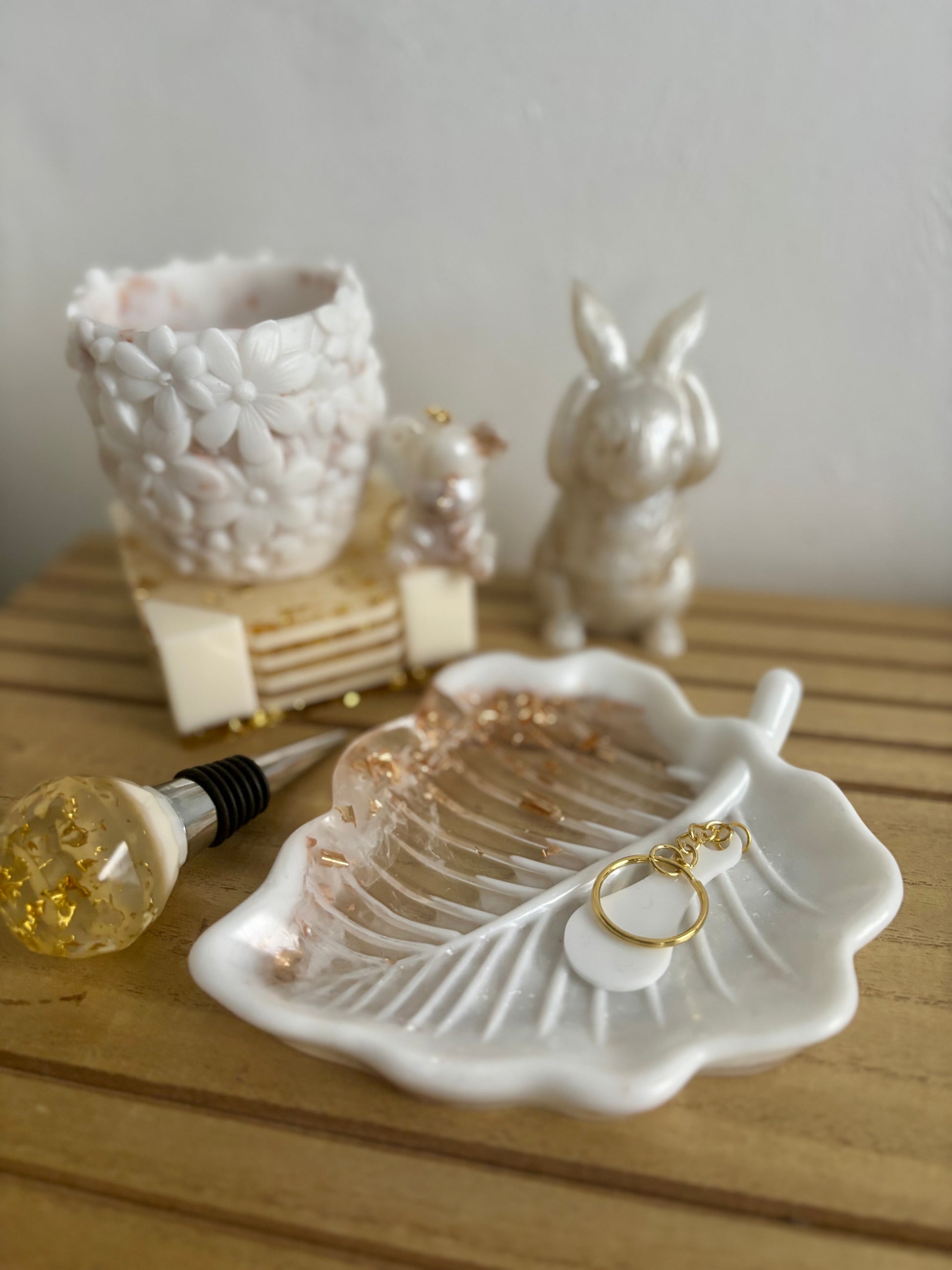 🍃 Une coupelle feuille — mélange de blanc et gold, idéale pour bijoux, clés ou petites douceurs.